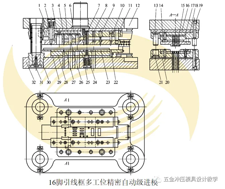 一个典型的多工位精密自动级进模由模板、条带、冲头、导柱、导套、定位销、螺钉、浮升销、卸料装置等零部件组成,如图所示为16脚引线框多工位精密自动级进模。
