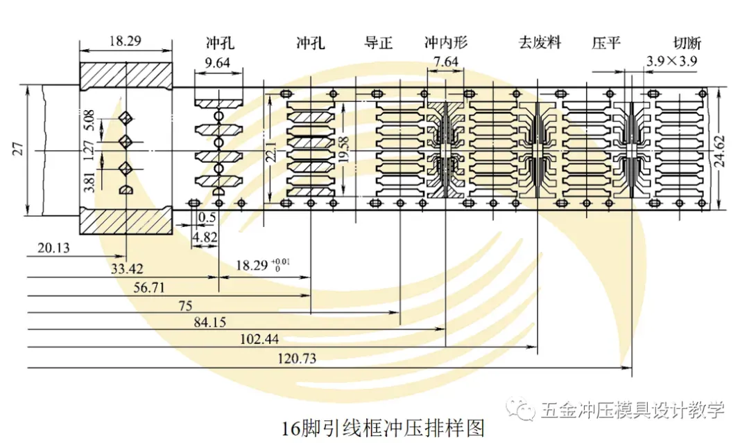 (4)为了塑封模的定位,各引线粗细应均匀,要求每10个引线框成一组 其孔距积累误差(18.29×10=182.90-0.02mm),不准超过0.02mm,因此每工步的平均误差应小于0.002mm。