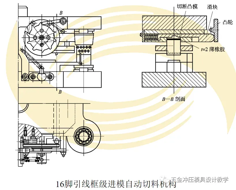 (8)为了获得每10个引线框为一组的引线条,便于集成电路塑料封的大量生产,该模具采用了由端面凸轮和棘轮及切刀等组成的自动切料机构。