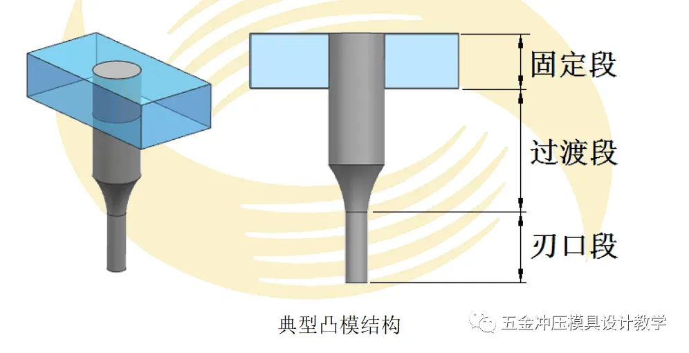 级进模的典型凸模结构如图所示,按照凸模各部分的作用,可把它划分为刃口段、固定段和中间过渡段。