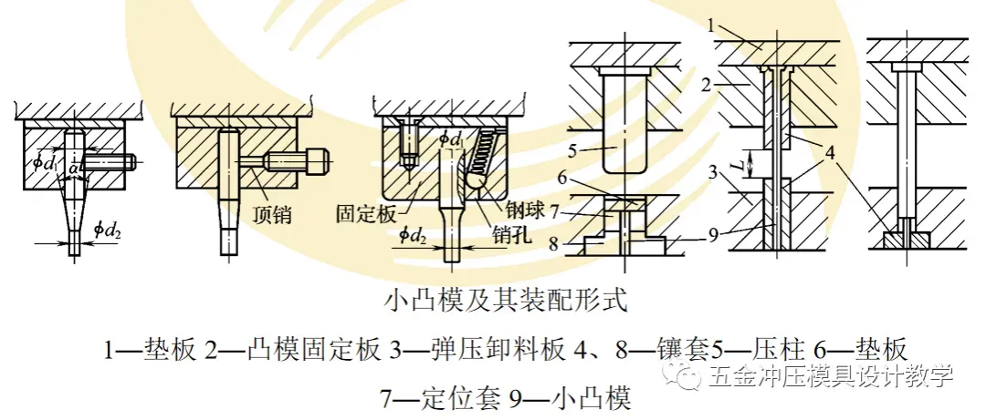 对于冲小孔凸模,通常采用加大固定部分直径、缩小刃口部分长度的措施来保证小凸模的强度和刚度。当工作部分和固定部分直径相差太大时,可采用多台阶结构。各台阶过渡部分必须用圆弧光滑连接,不允许有刀痕。特小的凸模可以采用保护套结构。卸料板还应起到对凸模的导向作用,以消除侧压力对凸模的影响。常见的小凸模及其装配形式如图所示。