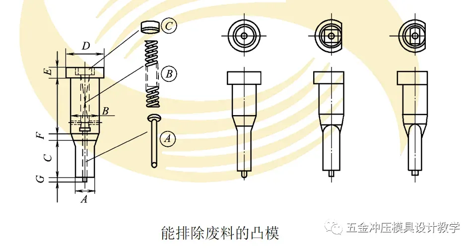 冲压生产中,冲孔后的废料若贴在凸模端面上,会使模具损坏,故对2mm以上的凸模应考虑废料的排除。如图所示为带顶出销结构凸模,它利用弹性顶销使废料脱离凸模端面。也可在凸模中心加通气孔,减小冲孔废料与冲孔凸模端面上的“真空区压力”,使废料易于脱落。