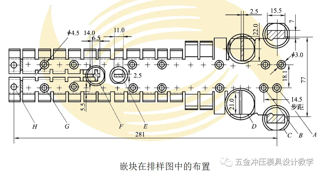 需要指出的是,采用嵌块式凹模,嵌块在排样图设计时,就应考虑其布置的位置及大小,如图所示。