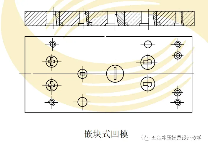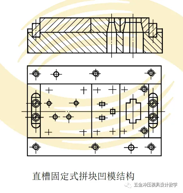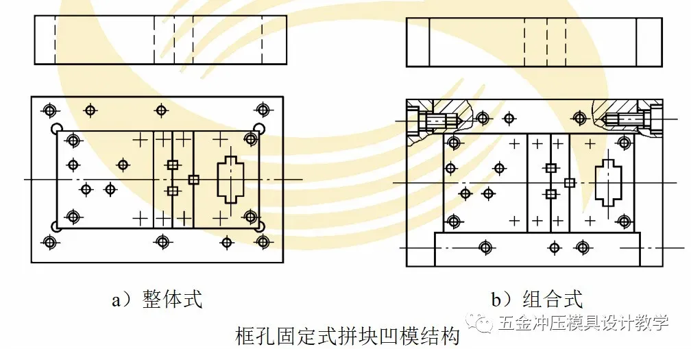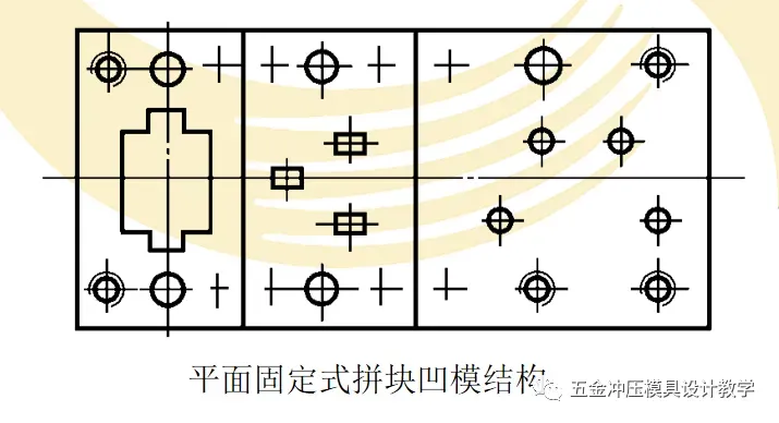 根据需要,凹模可以采用多种固定方式。就拼块凹模而言,通常有平面固定式、直槽固定式和框孔固定式。