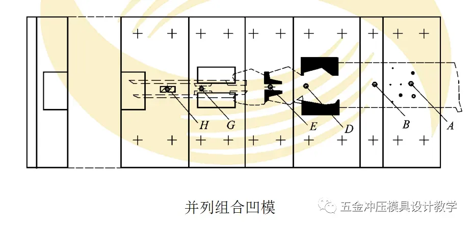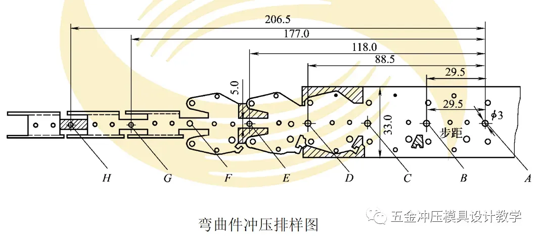 2)拼块式凹模。拼块式凹模的组合形式因采用的加工方法不同,分为两种组合形式:放电加工拼块拼装凹模、成形磨削拼装组合凹模。现以如图所示某弯曲件冲压排样图为例,对两种组合形式的凹模加以说明。