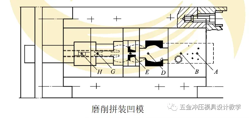 多工位精密自动级进模凹模的结构与制造比凸模更为复杂,多采用拼块式和嵌块式结构,这样做的优点在于:简化制造,冲模精度高,节省贵重金属,易于控制热处理变形,方便装配调整。