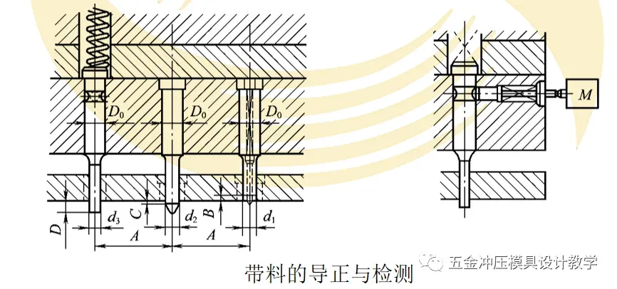 在多工位精密自动级进模中,带料的送进步距及定位精确必不可少,为此,一般采用导正销与侧刃配合使用,侧刃作定距和粗定位,导正销作为精定位。此时,侧刃长度一般大于步距0.05~1mm,以便导正销入孔时,条料略向后退。在自动冲压时,可不用侧刃,条料的定位与送进靠导料板、导正销和送料机构来实现。