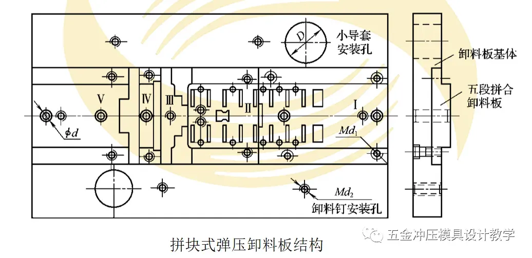 多工位精密自动级进模的弹压卸料板,由于型孔多、形状复杂,为保证型孔尺寸精度、位置精度和配合间隙,通常采用分段拼装结构固定在一块刚度较大的基体上,如图所示为其结构示意。