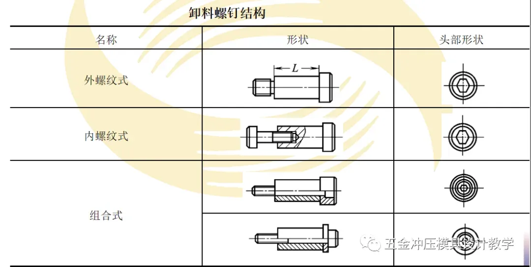 卸料板采用卸料螺钉吊装在级进模上模。卸料螺钉应对称分布,工作长度要严格一致。多工位精密自动级进模使用的卸料螺钉结构见下表。