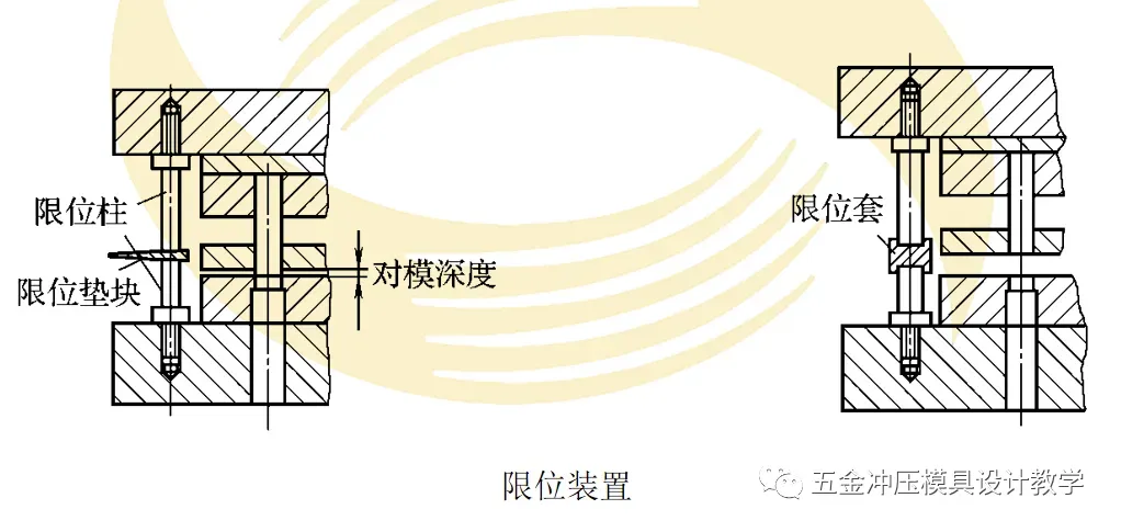级进模结构复杂,凸模较多,在存放、搬运、试模过程中,若凸模过多地进入凹模,容易损伤模具。为此,在级进模结构中,安装有限位装置,其结构示意如图所示。