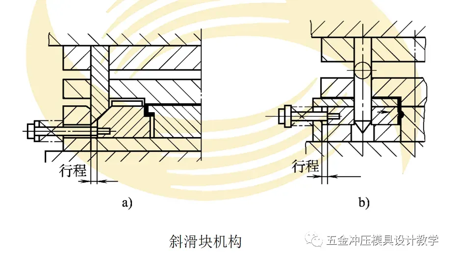 在级进弯曲或其他成形工序冲压时,往往需要从不同方向进行,因此,需要将压力机滑块垂直向下的运动,转化成凸模(或凹模)向上或水平等不同方向的加工。完成这种加工方向转换的装置,通常采用斜楔滑块机构或杠杆机构,其结构示意如图所示。