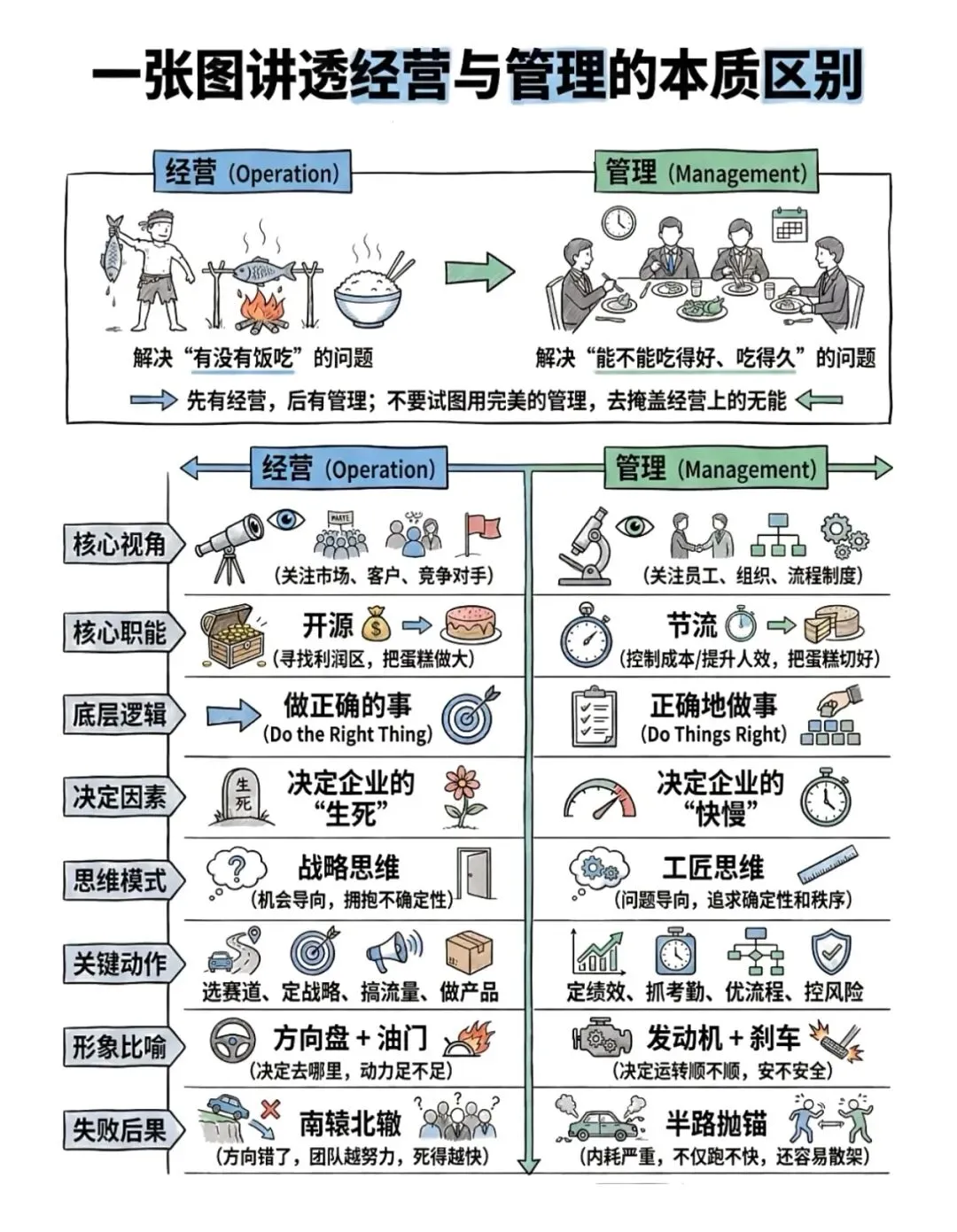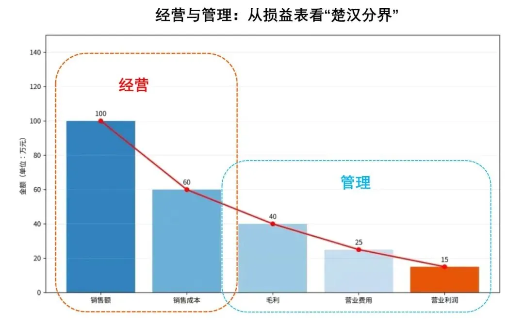 经营管“钱从哪来、能赚多少”,关注价值创造与兑现;管理管“事怎么成、人怎么动”,关注稳定执行与效率最优。 无经营,管理是无米之炊;无管理,经营是空中楼阁。经营对收入负责,管理对成本负责,二者一攻一守,缺一不可。