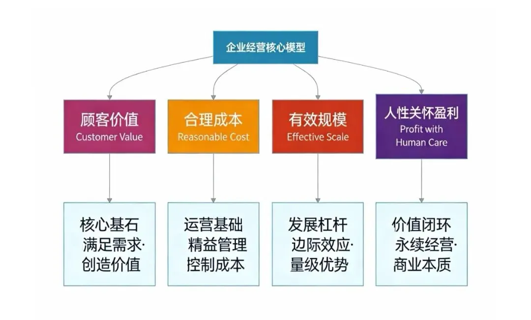 经营不是灵光一现,而是一套在不确定中持续赢的系统能力。陈春花老师说:经营就是用有限的资源创造一个尽可能大的附加价值,再用这个附加价值去满足人们无限的需求。经营的基本元素只有四个:顾客价值、合理成本、有效规模、具有人性关怀的赢利。