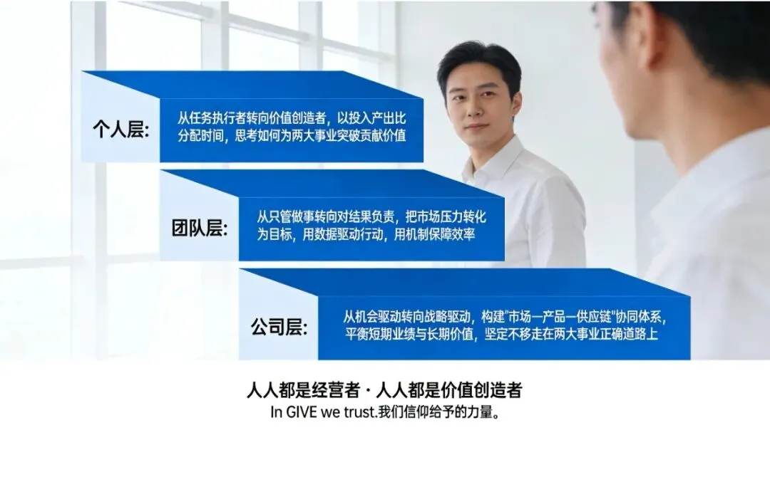 · 个人层:从任务执行者,转向价值创造者。以投入产出比分配时间,思考如何为两大事业的突破贡献价值。