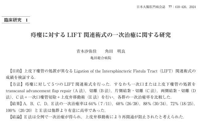 Aoki S, Tsunoda A. A Study on Primary Healing of Modified Techniques for Ligation of the Intersphincteric Fistula Tract for Low Transsphenicteric or Intersphincteric Fistula-in-ano. 日本大腸肛門病会誌. 2024;77(7).