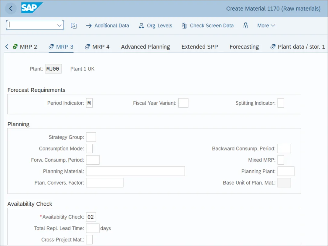 下图显示了物料主数据的 MRP 2 视图。它包含与物料采购、排程和净需求计算相关的属性。采购类型指示物料是在内部生产、外部采购还是两者皆有。从下拉菜单中为物料选择一个采购类型。下表显示了标准系统中可用的采购类型。特殊采购类型,如寄售、分包、库存转移等,在工厂级别的配置设置中定义。如果物料的采购类型是外部采购或外部和内部采购皆有,则为物料选择任何适用的特殊采购类型。生产存储地点取决于物料是在内部生产还是作为生产过程所需的组件(如原材料)。如果物料在内部生产,则在此字段中分配的存储地点将是接收生产物料的地点。如果物料是原材料,则在此字段中分配的存储地点将是向生产发放物料的地点。如果物料的采购类型是外部采购或内部和外部采购皆有,则为物料选择一个外部采购的存储地点。在 MRP 生成采购建议时,此存储地点将作为采购申请的默认值。如果物料是在制造最终产品、主要产品或成品时生产的联产品,则设置此指标。如果物料以批量方式生产或采购,且无需在 MRP 中对该物料进行计划,则设置此指标。这些物料(如钉子、油等)可批量用于生产活动。制造设施会保留一定数量的物料作为安全库存,以满足意外需求。在此以基本计量单位指定安全库存数量。最小安全库存字段也用于相同目的,但用于满足意外需求所需的最低安全库存水平。下图显示了物料主数据的 MRP 3 视图。它包含与物料预测、计划和可用性检查相关的属性。为物料预测或物料计划指定一个期间指标,如 M(月)、W(周)或 T(日)。策略组用于对可用于物料的多个计划策略进行分组,如按订单生产、按库存生产等。在此为物料选择一个策略组。物料的消耗模式指示系统如何消耗需求。表 3.10 显示了可供选择的值。在反向消耗中,销售订单、预留等消耗需求日期之前的计划独立需求。在正向消耗中,销售订单、预留等消耗需求日期之后的计划独立需求。在此根据为物料设置的消耗模式,以天(最多 999 天)为单位指定正向消耗期间或反向消耗期间。可用性检查组在为执行 MRP 提供准确的库存可用性信息方面起着至关重要的作用。这用于在 SAP S/4HANA 中配置可用性检查。在此为物料指定可用性检查组。你若喜欢,点个❤️谢先👇