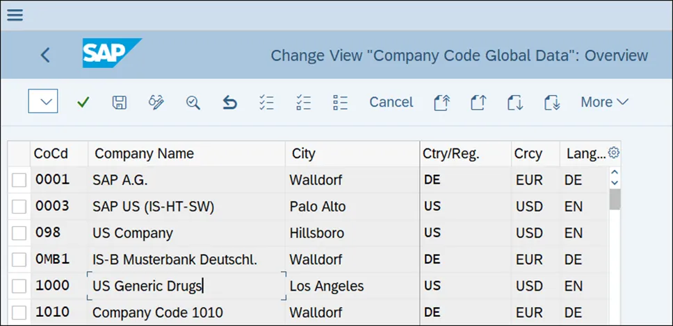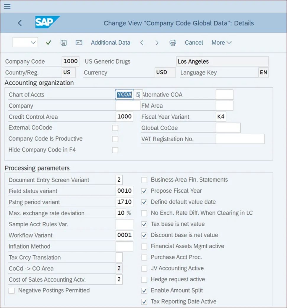 接下来,系统会检查参考公司代码的货币分配,并询问您是否要更改目标公司代码的货币,如下图所示。在我们的示例中,美元是合适的,所以我们点击“是”按钮进行确认。然后系统会显示如下图所示的消息,提醒您并非所有公司代码的配置设置都会被复制。接下来,系统会询问您是否要复制源公司代码的编号范围,如下图所示。不过,我们不建议复制编号范围,因为这可能会导致不一致。现在,返回并选择“编辑公司代码数据”活动,以显示系统中存在的公司代码列表。从下图所示的列表中双击新的公司代码 1000,以更改其基本数据。通过维护“公司名称”、“城市”、“国家/地区”、“货币”和“语言”字段,输入此公司代码所需的详细信息,如下图所示。接下来,按照菜单路径“财务会计 • 财务会计全局设置 • 公司代码全局参数 • 输入全局参数”维护公司代码的全局设置。然后,从下图所示的屏幕中双击您要检查或修改的公司代码。双击公司代码 1000:美国仿制药公司,这将允许您修改其设置,如下图所示。会计科目表定义了所使用的总账科目,并在中央级别(对所有公司代码有效)和公司代码级别进行维护。在此字段中,您可以配置公司代码要使用的会计科目表。在此字段中,您可以输入公司代码所属的公司。该公司代表公司代码的母公司法律实体。此字段用于对公司代码进行信用管理。通过此控制范围,管理公司代码客户的可用信用额度。此字段是该公司代码使用的会计年度变式。会计年度变式确定用于在财务会计中过账凭证的期间和日历分配。例如,标准的 SAP 会计年度变式 K4 与日历期间匹配:期间 01 对应 1 月,期间 02 对应 2 月,依此类推。但是,您可以使用其他会计年度变式,例如在美国流行的 4 - 4 - 5 日历,其中每个季度由三个期间组成,分别为四周、四周和五周。字段状态变式确定在过账财务凭证时哪些字段是必填的、可选的和禁止的。SAP 中的过账期间变式确定哪些期间对过账开放和关闭。此变式为各类账户(总账、客户、供应商、资产等)提供了分别打开和关闭期间的选项。在此字段中,指定公司代码使用的过账变式。你若喜欢,点个❤️谢先👇