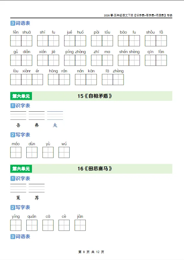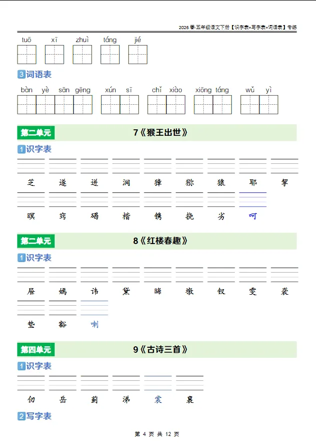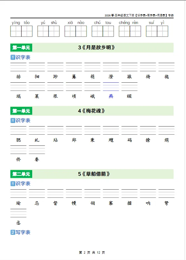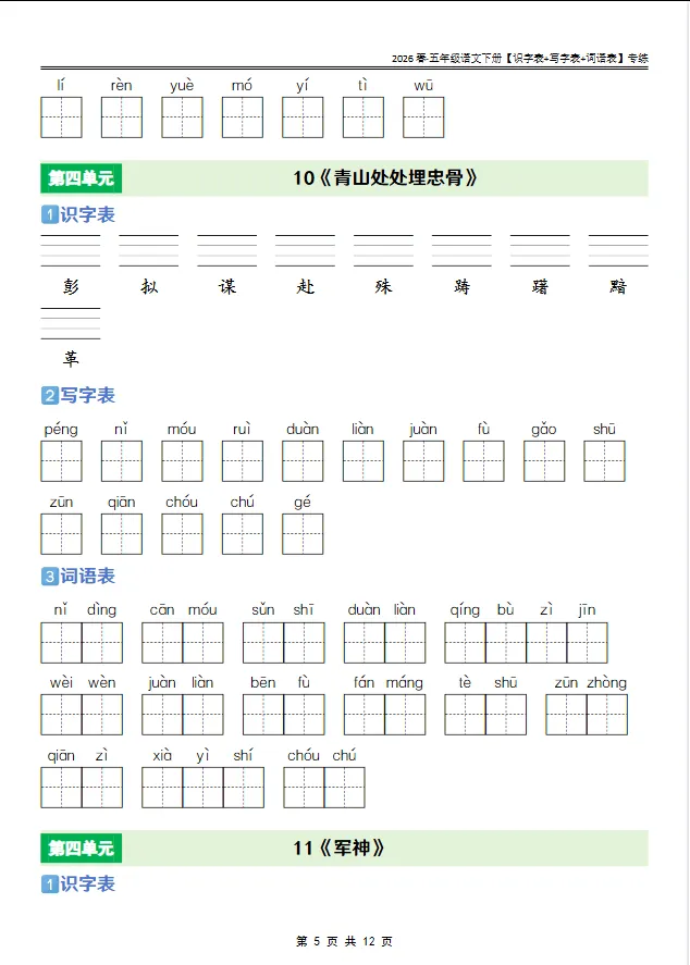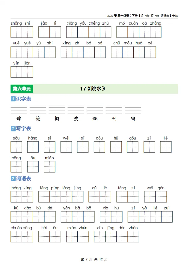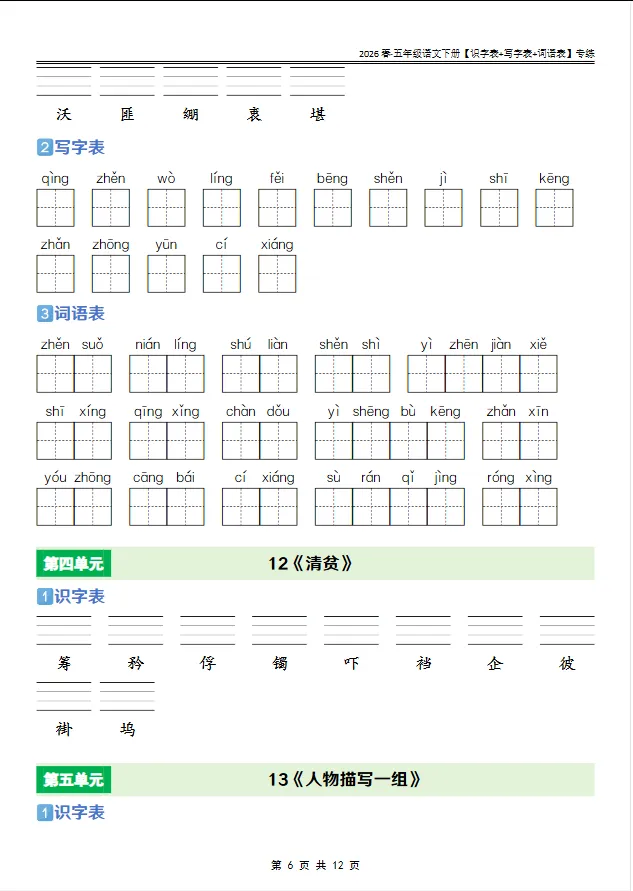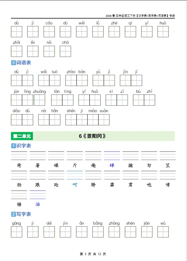 学习资料库 2-27【人教版 2026春· 五年级语文下册[识字表+写字表+词语表]专练】