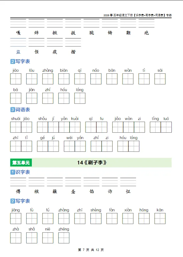 >学习资料库 2-27【人教版 2026春· 五年级语文下册[识字表+写字表+词语表]专练】