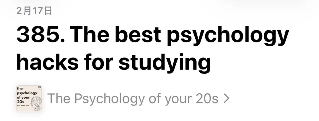 今天想分享的播客单集来自The psychology of your 20s(一档心理学相关的英文播客)《The Best Psychology Hacks for Studying》,主播Jemma Sbeg分享了9个提升学习效率的心理学小技巧。