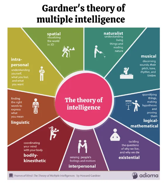 心理学家加德纳(Howard Gardner)提出多元智能理论,认为人的智能不只有一种,而是至少8种,其中包括视觉空间型、听觉型、动觉型、语言型、逻辑型、人际型、内省型、自然观察型。每个人都有自己天然偏好的信息处理方式。