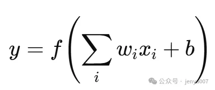 计算单元:它接收若干输入 x1, x2, …,每个输入乘以一个权重 wi,相加后加上偏置 b,再经过一个非线性函数(激活函数)f 输出值: