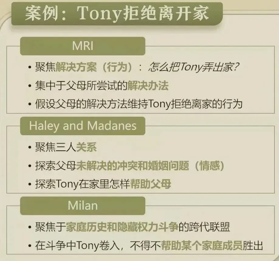 核心概念1:循环因果——不去寻找家庭问题的“起因”与责任人,家庭问题是由一系列行动与反馈维系的。核心概念2:系统论——看到因果循环,识别维持问题的反馈环路,找到改变规则的方式,中断维持问题的行为。核心概念3:改变——一级:症状消失;二级:家庭规则改变。比如爸妈吵架→孩子成绩下降→爸爸责备妈妈→爸妈吵架,改变循环,可以把爸妈吵架变为爸爸或妈妈辅导孩子,把爸爸责备妈妈变为爸妈商量对策。核心概念4:家庭规则——家庭互动过程中,往往有规则在运作,以保持家庭的固有平衡,但家庭有时都没意识到这些规则的存在。家庭的某些困难或症状,因被错误的解决方案误导,而变成了慢性问题。核心技术1:再定义——将家庭的某个问题进行积极的再解释,以有益于治疗和改变。通常会在定义为关系层面的问题,比如核心技术2:循环提问——就一个问题,依次提问所有来访成员,使对问题看法的差异变得明显。核心技术3:反其道而行之——维持或增加现有症状或互动模式,让放大的结果促进改变。