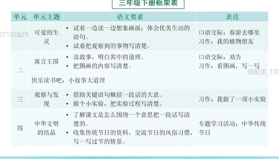 这是三年级下册的框架表。可以看到,所谓双线结构指的是人文主题和语文要素这两条线索。一方面,教材加强不同年段不同册次之间的纵向联系,体现由易到难由浅入深的发展梯度。另一方面,着力加强单元内部的横向联系,使各部分内容形成合力,共同促进学生发展。