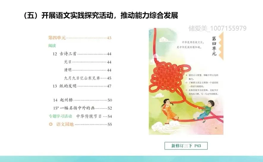 第五方面特点是展开语文实践探究活动,推动能力综合发展。除了前面已经讲到过的梳理与交流板块,三年级下册还依托专题学习活动引导学生开展合作探究的语文实践。第四单元穿插安排了专题学习活动“中华传统节日”。这也是全套教材中首次出现专题学习活动。学生在围绕具体任务展开小组协作的过程中,能够实现语文知识与生活应用的结合,培养自主合作能力。同时通过跨学科的语文实践,在趣味活动中学习语文,学会合作,融合文学、历史、美术、音乐等多学科知识,探索节日文化,加强学科间的相互关联。本单元编排的课文都与中华优秀传统文化有关,围绕生活中的传统节日展开的专题学习活动,即和单元内容密切相关,又和学生的生活紧密结合。分为三个阶段。一是组成小组,分工合作,收集资料,二是小组交流,讨论怎样进行学习成果展示,三是展示分享,用各种形式展示学习成果。在第十二课、十三课的课后以及语文园地前,分别安排了专题学习活动的活动提示,提示了活动内容、活动方式、活动途径和成果展示交流的方式,引导学生通过多种途径搜集、介绍我国传统节日的资料,丰富探究素材,并通过写过节的过程和交流节日的风俗习惯等多元形式呈现探究结果,促进交流与能力提升,从而在活动中深入领略中华优秀传统文化的魅力。