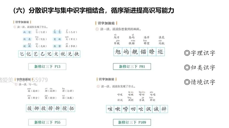 最后一个方面的特点是分散识字与集中识字相结合,循序渐进,提高实写能力。与三年级上册一样,三下依然采用集中识字与随文分散识字相结合的编排方式。分散识字及随课文学习,这一直是学生识字的主要方式。集中识字主要指语文园地中的识字加油站板块,通过创设情境引导学生自主识字。同时,渗透字理识字、归类识字、情境识字等多种识字方法,旨在激发学生的学习兴趣,加深对汉字声旁表音、形旁表意等构字规律的认识,感受汉字中丰富的文化内涵。书写教学方面,全册语文园地中共安排了两次书写提示。在三年级上册的基础上,三年级下册进一步提示了关于笔画长短、间距等间架结构方面的书写要点,指导学生在写正确的基础上把字写美观。