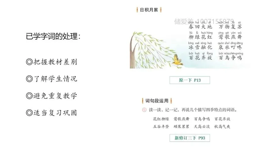 对已经学过的字词,建议三年级教师提前熟悉新修订教材的内容,明确和上一套教材的具体差别,并了解学生对课文字词的掌握情况,避免重复教学。如果有学生容易读错或写错的字词,可以适当复习巩固,比如结合书写提示板块的要求,让学生进一步练习易错字。有些词语曾经是上一套一年级下册日积月累中的内容,比如“莺歌燕舞、百花齐放”等等。调整之后,一些编入了新修订三年级下册第七单元的词句段运用。教学时可以自然激活学生已有的词语积累,在此基础上拓展更多类似的词语。