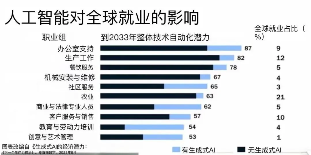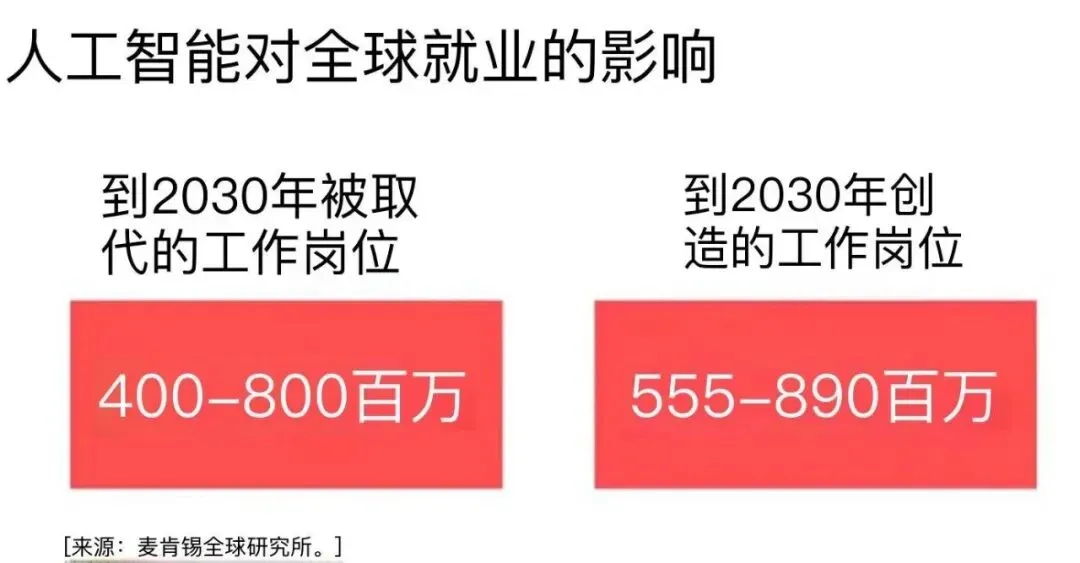 麦肯锡全球研究院估计:到2030年,AI自动化可能取代4亿到8亿个工作岗位。