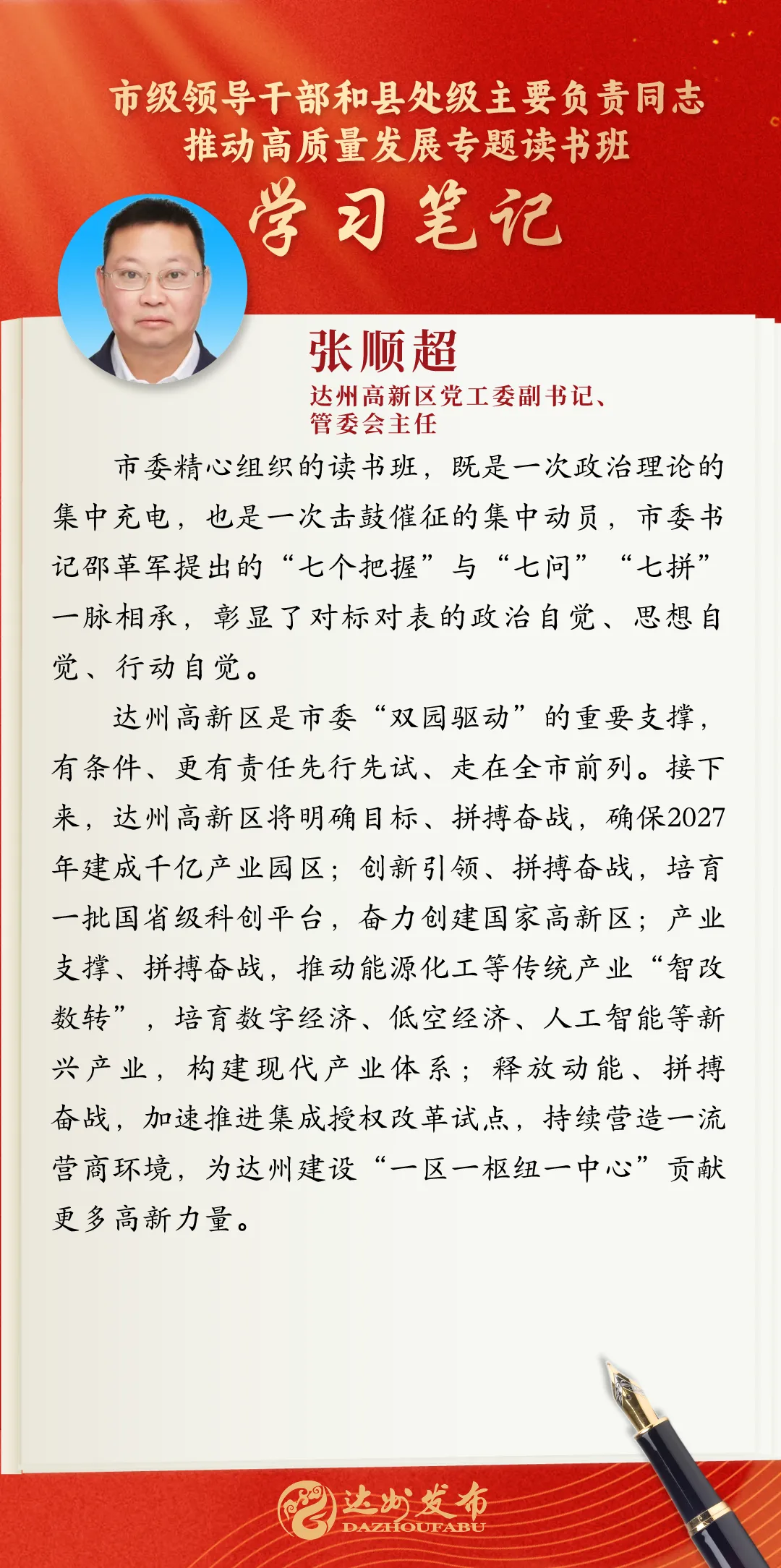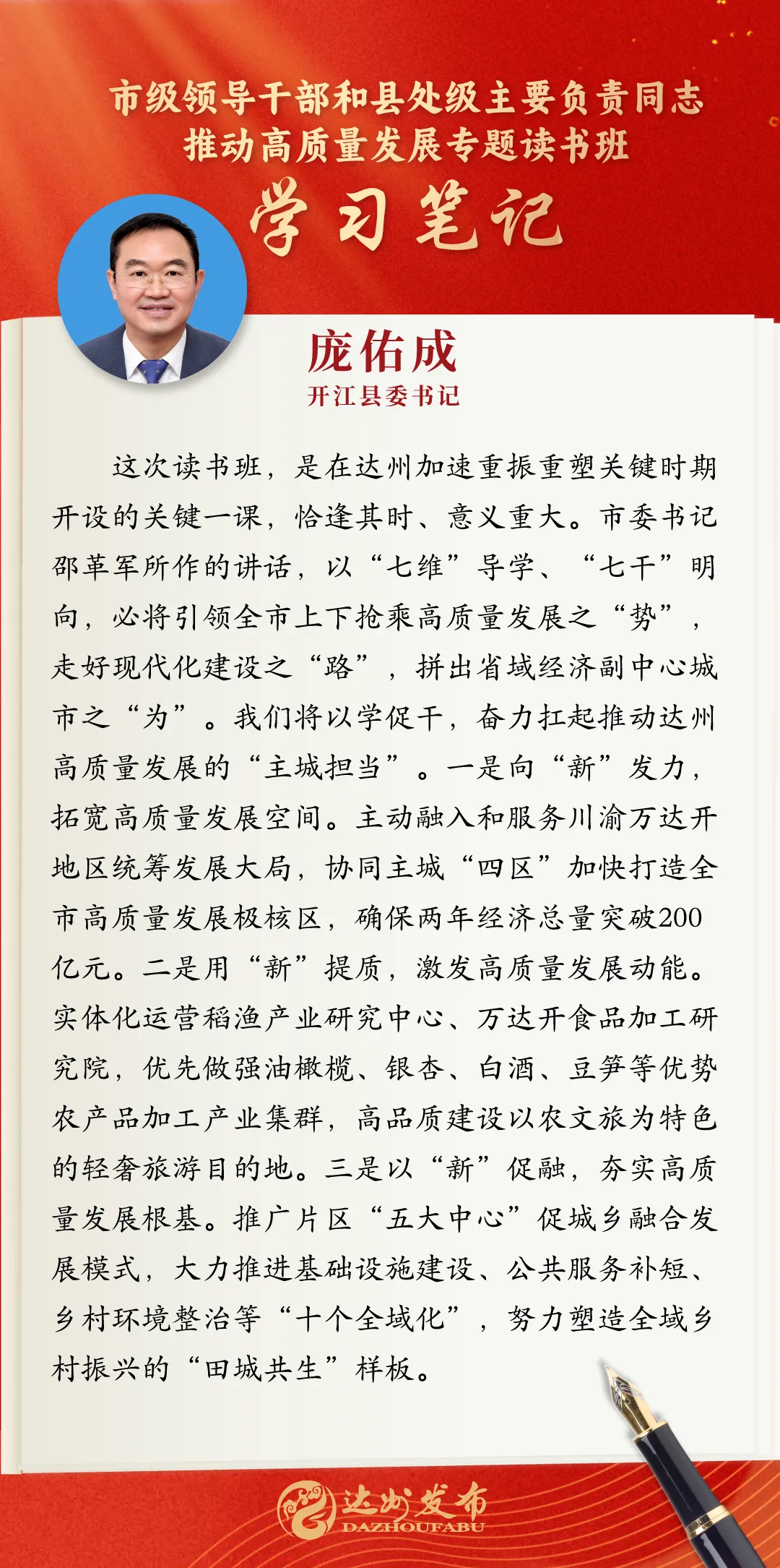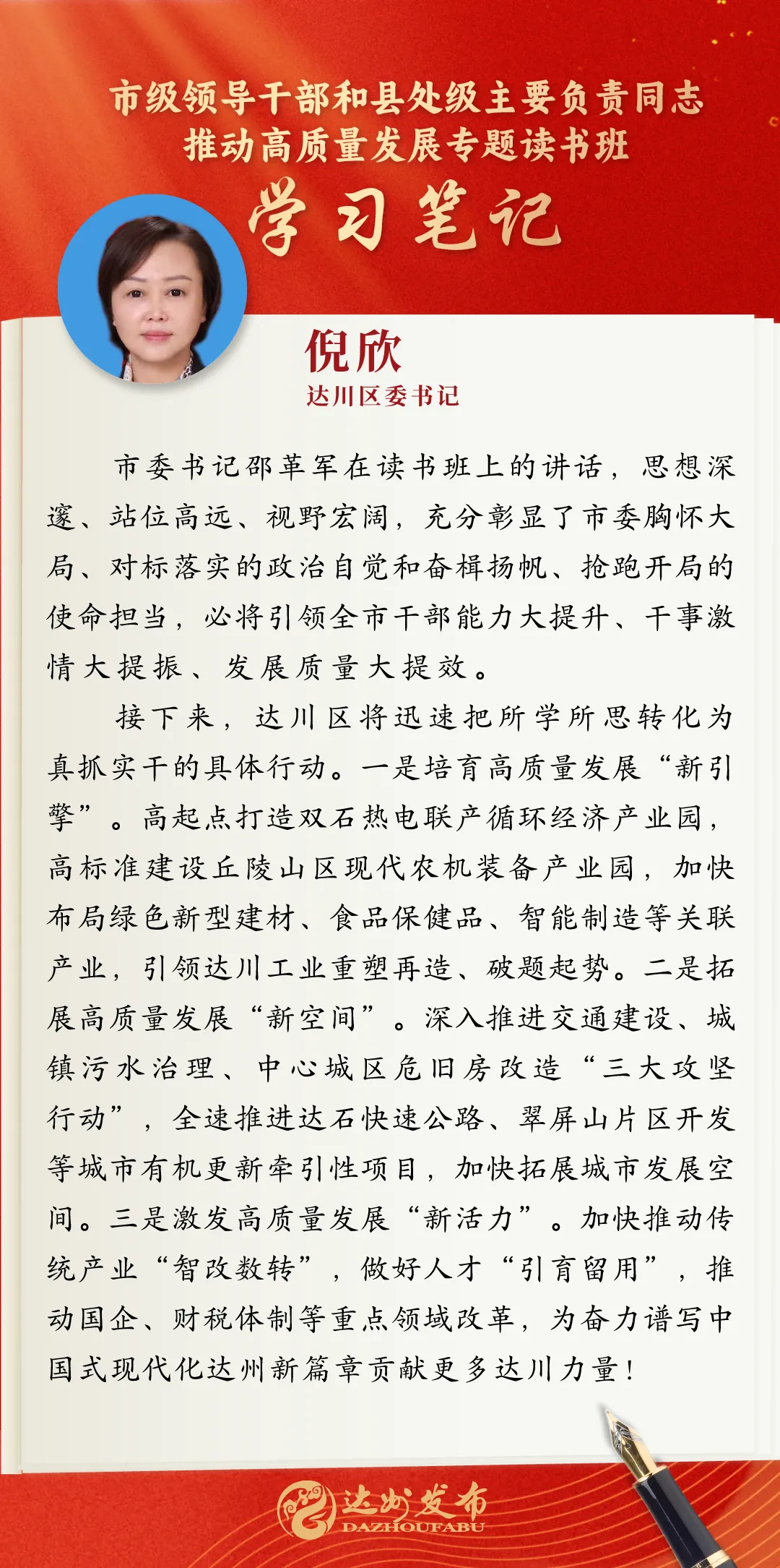 读书班期间,学员们专注聆听专题辅导,认真细心细致记录、广泛开展课后交流,力求做到入脑入心;在分组讨论时,学员们又将理论知识与自身工作领域结合踊跃发言、分享感悟和心得体会,营造出热烈活跃的氛围,力求在研讨交流中真正做到学深悟透,为重振巴渠雄风、重塑大市荣光贡献更多力量。