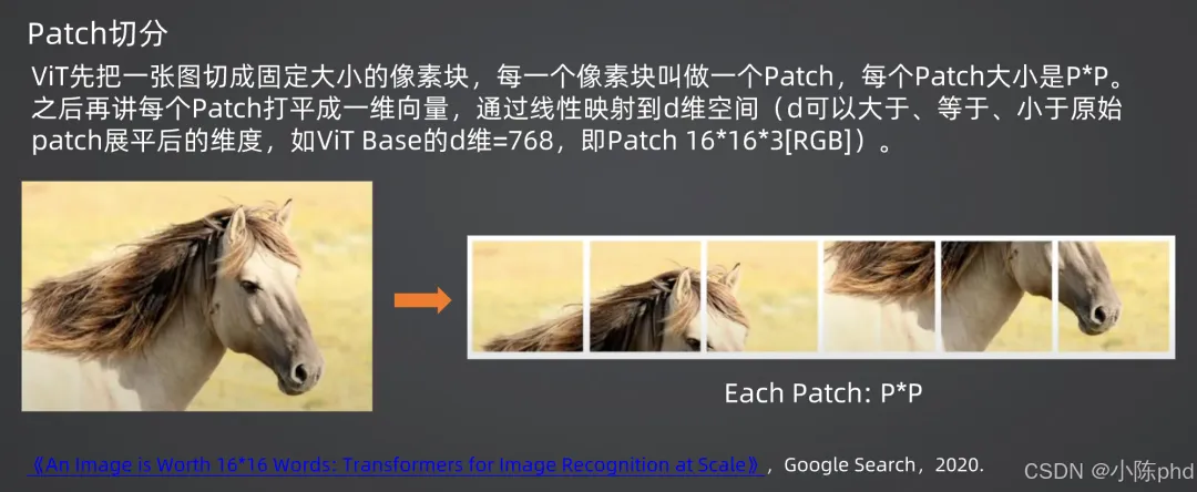 为了将Transformer应用于图像领域,Google于2020年提出ViT(Vision Transformer),核心思路是将图像转换为序列,适配Transformer的输入格式: