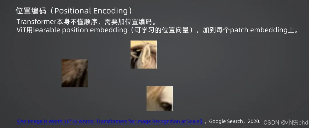 - 2. 位置编码:Transformer本身不理解序列顺序,因此ViT引入可学习的位置向量(Learnable Position Embedding),添加到每个Patch Embedding中,保留图像的空间位置信息;