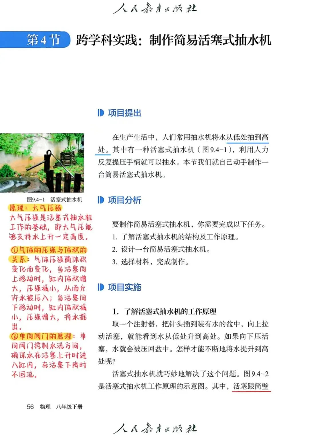 >【教材学习笔记】人教版八年级下册物理-9.4跨学科实践:制作简易活塞式抽水机