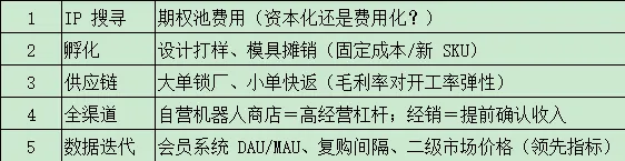 关键指标不是收入增速,而是“单 IP 现金流半衰期”,把每个系列IP计算 IRR: IRR = [(首年销售额 – 模具摊销 – 渠道返点 – 存货减值)+ 二手市场溢价抽成] / 首年营销费用 。