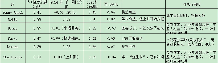泡泡头部6个IP用 Google Trends+闲鱼均价+天猫月销做面板数据,可拟合出“热度衰减函数”:log(均价t / 发行价) = α – β·t^0.5 ,β 越大衰减越快。