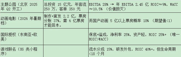 四、业务扩张风险。公司多元化路径的“ROIC 门槛” 即主题公园、动画、游戏、国际授权四条路,那么用 ROIC 是否>WACC 做筛选。