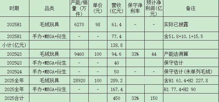 泡泡2025前三季收入 ≈ 138.8 + 122 = 260 亿元,已超 2024 全年(约 190 亿元)。净利 68~70 亿元,相当于2024全年的2倍。若Q4 保持Q3增速,2025 全年收入450亿元,同比 +125% 以上。