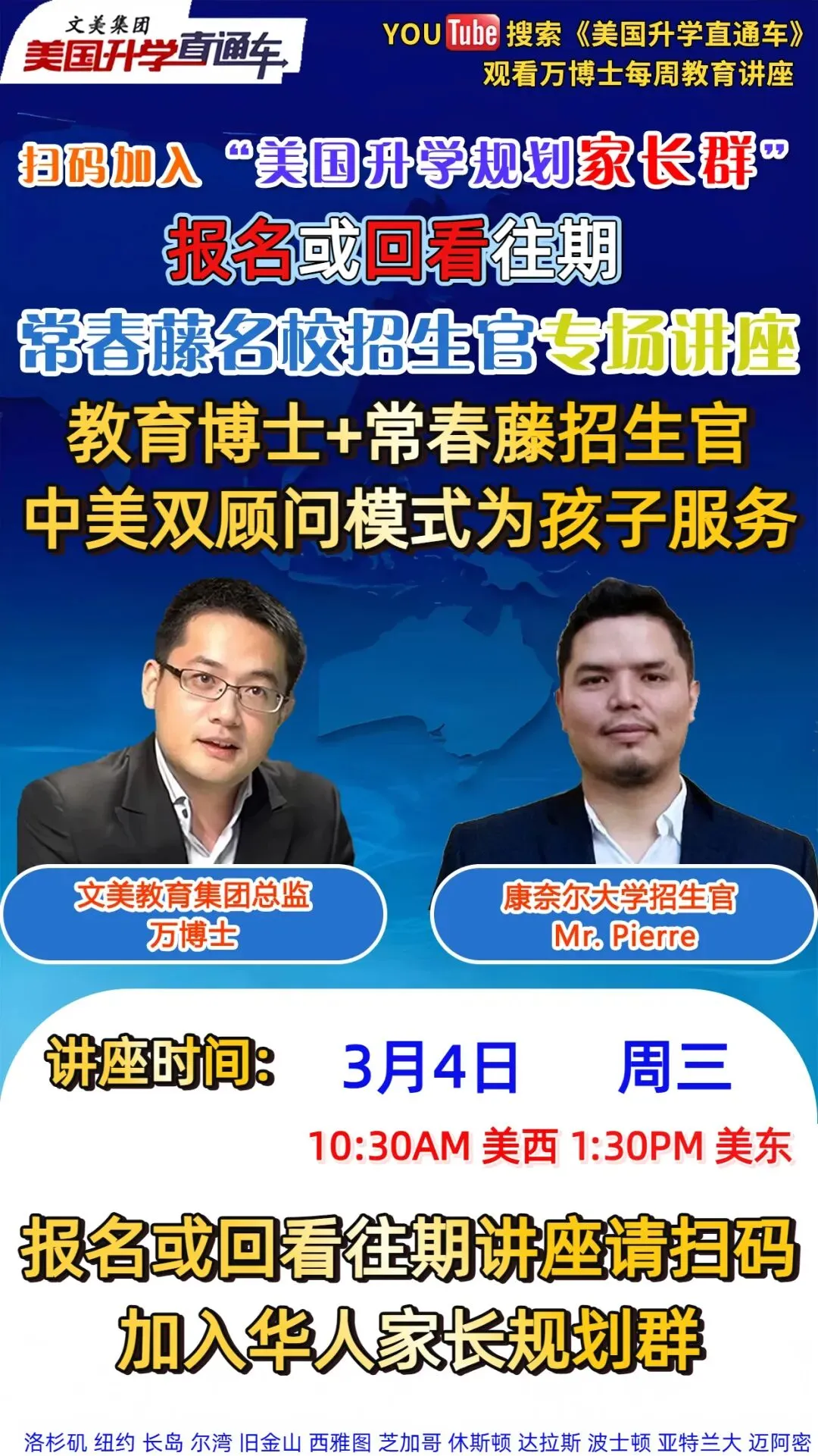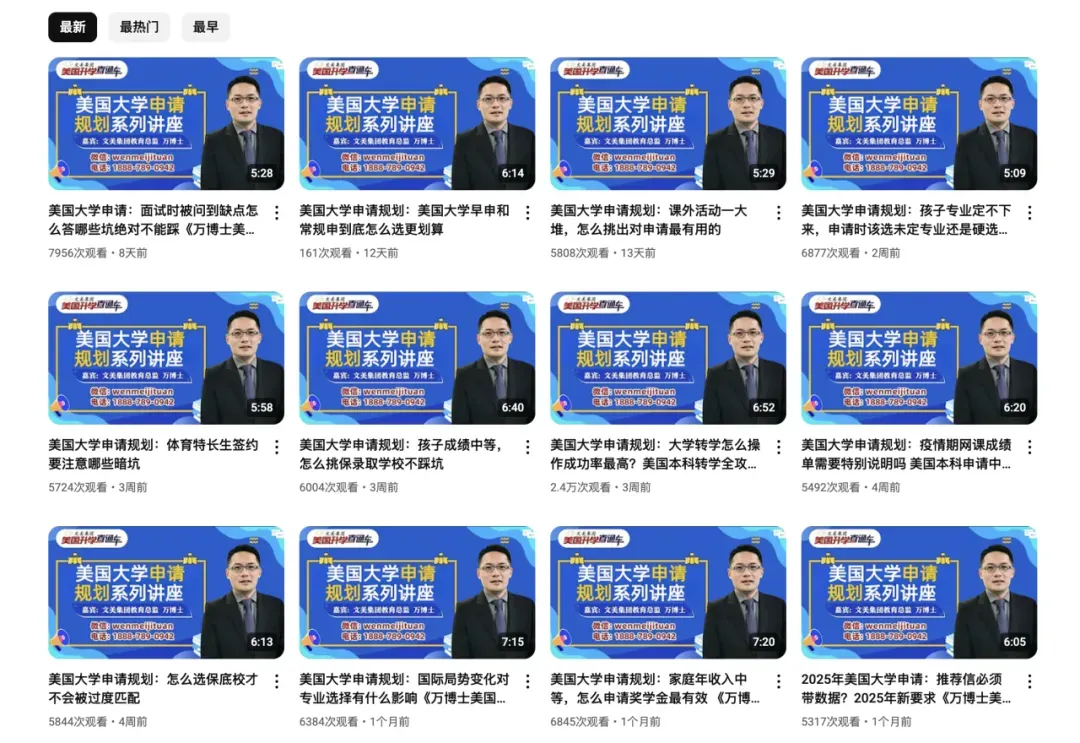 万博士每周都有《美国升学直通车》视频讲座,目前已有1000多期,总播放量上亿: