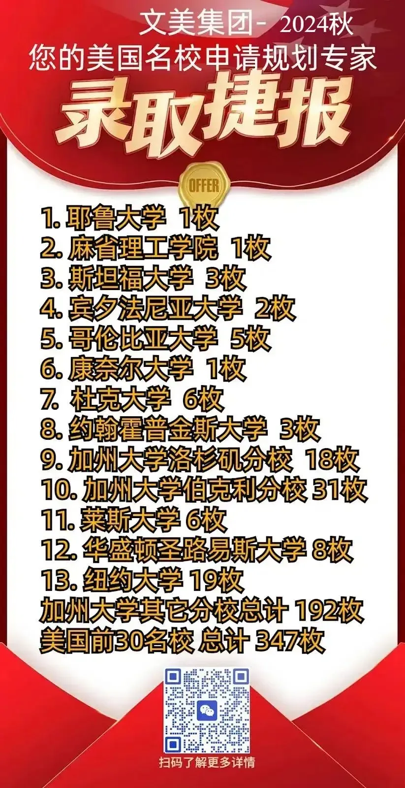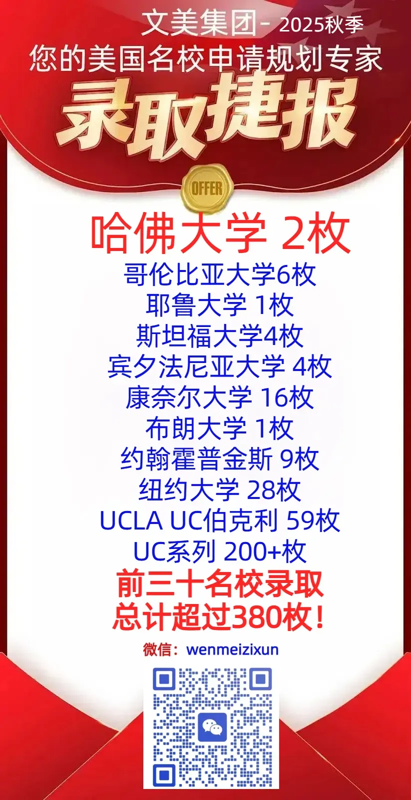 文美学员总计获15枚哈佛大学录取,超过500枚前十名校录取,超过1000枚前二十名校录取。