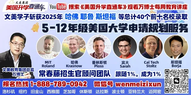 很多美高家庭都在焦虑:竞赛这么多,到底该选哪个?AMC、USACO、ISEF、写作竞赛……方向选错,努力可能白费,大把时间一去不复返,成了“陪榜生”。其实真正拉开差距的,不是盲目刷题,而是用对资源、走对路径。我们整理了系统的美高竞赛解析与高含金量学习资料,帮助家长看清赛道逻辑,让孩子少走弯路、事半功倍。加入升学规划群(二维码在文末),免费领取核心资料包,一起为申请提前布局。为了帮更多家庭拆解这种“美本规划的认知黑盒”,我们特别邀请到了专注美国大学申请规划20年,已帮助学生获得15个哈佛Offer、超500个全美前十Offer的知名名校申请规划专家——文美教育集团万博士及其团队,为所有关心教育的家长举办一场免费公益讲座。