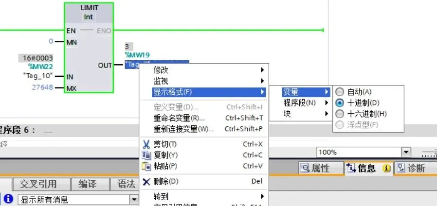 六、数学函数输出的是16进制,怎么变成十进制,其实就是在OUT输出的Tag上点右键,显示格式-程序段,变量哪个方便改就把那个改成10进制。显示的就是十进制了。