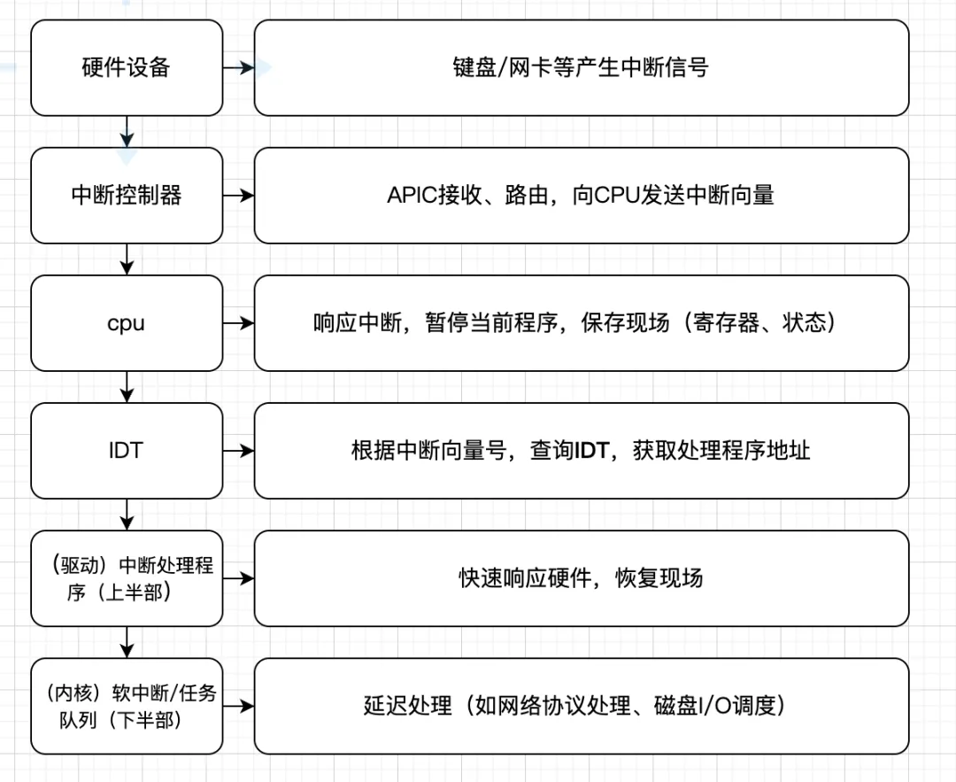 IDT(Interrupt Descriptor Table,中断描述符表)是 CPU 的一个核心数据结构,它是一张存储在内存中的“路由表”。它的唯一作用就是告诉 CPU:当发生特定编号的中断、陷阱或异常时,应该跳转到哪个内核函数去处理
