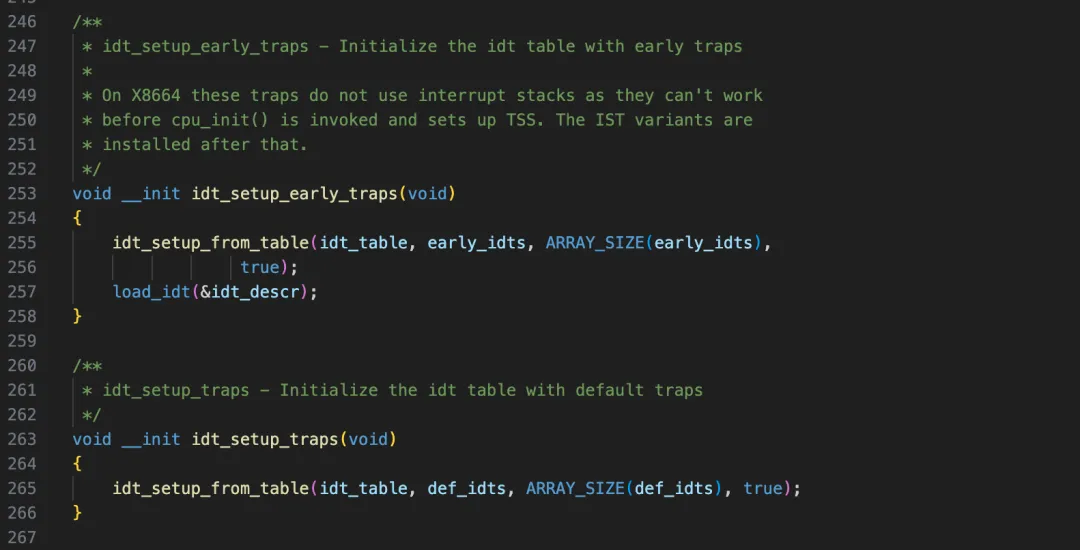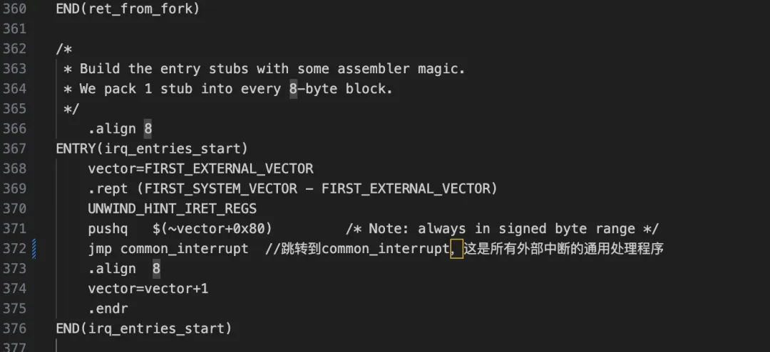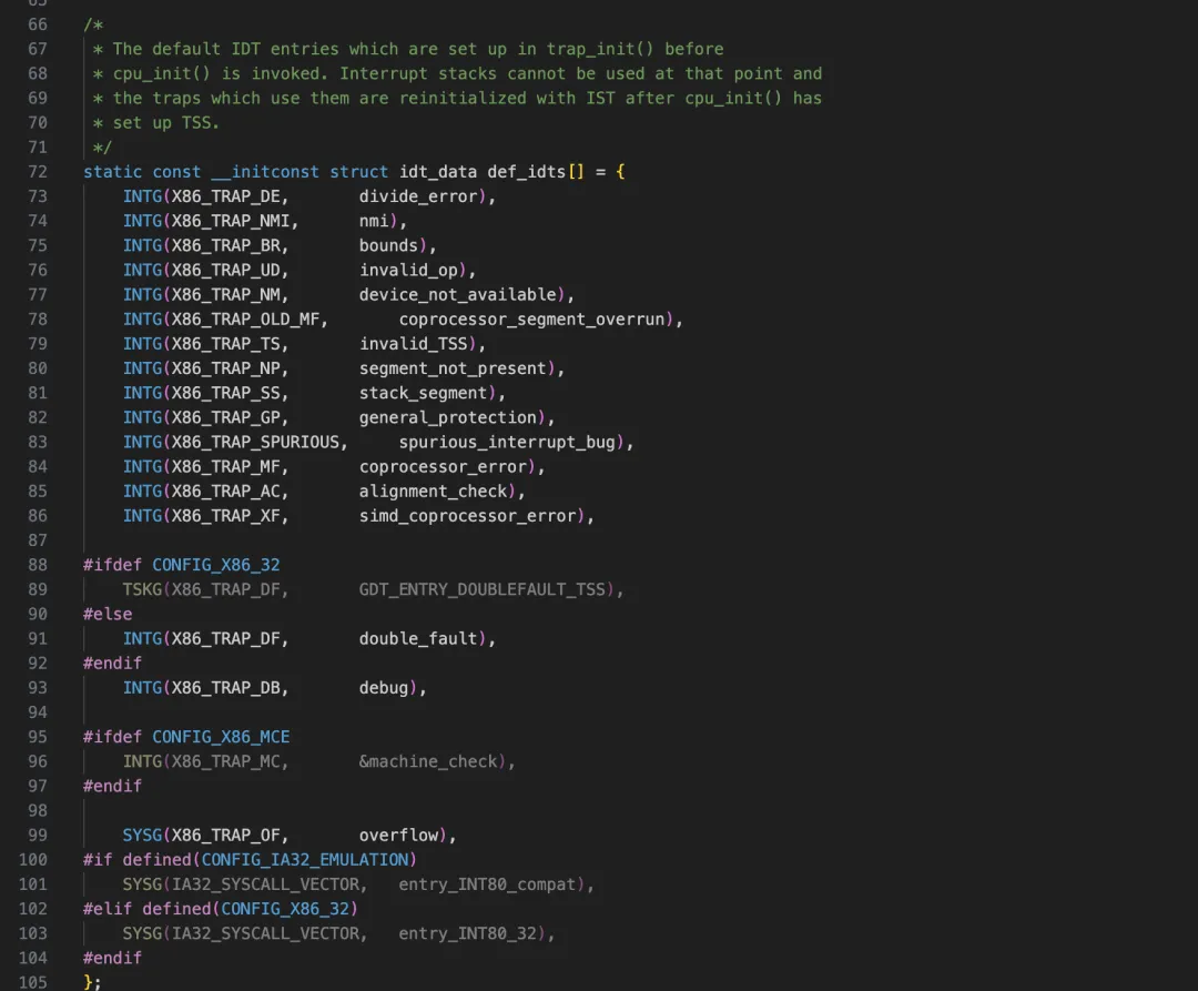 void __init idt_setup_apic_and_irq_gates(void){ int i = FIRST_EXTERNAL_VECTOR; //i = 0x20 (32) void *entry; //用于存储中断处理程序的入口地址 idt_setup_from_table(idt_table, apic_idts, ARRAY_SIZE(apic_idts), true); for_each_clear_bit_from(i, system_vectors, FIRST_SYSTEM_VECTOR) { entry = irq_entries_start + 8 * (i - FIRST_EXTERNAL_VECTOR); set_intr_gate(i, entry); }#ifdef CONFIG_X86_LOCAL_APIC for_each_clear_bit_from(i, system_vectors, NR_VECTORS) { set_bit(i, system_vectors); entry = spurious_entries_start + 8 * (i - FIRST_SYSTEM_VECTOR); set_intr_gate(i, entry); }#endif}