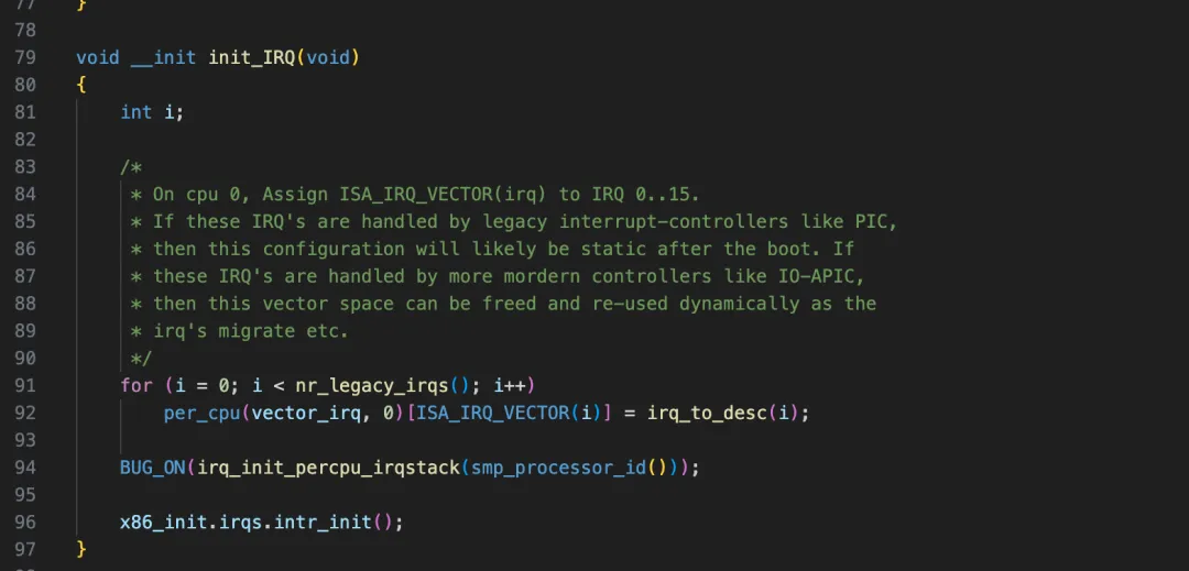 在Linux内核中,start_kernel()会调用trap_init()来初始化前32个陷入或者异常中断,然后调用init_IRQ()来初始化设备中断。在init_IRQ()中,调用到native_init_IRQ(),最终会调用到idt_setup_apic_and_irq_gates()