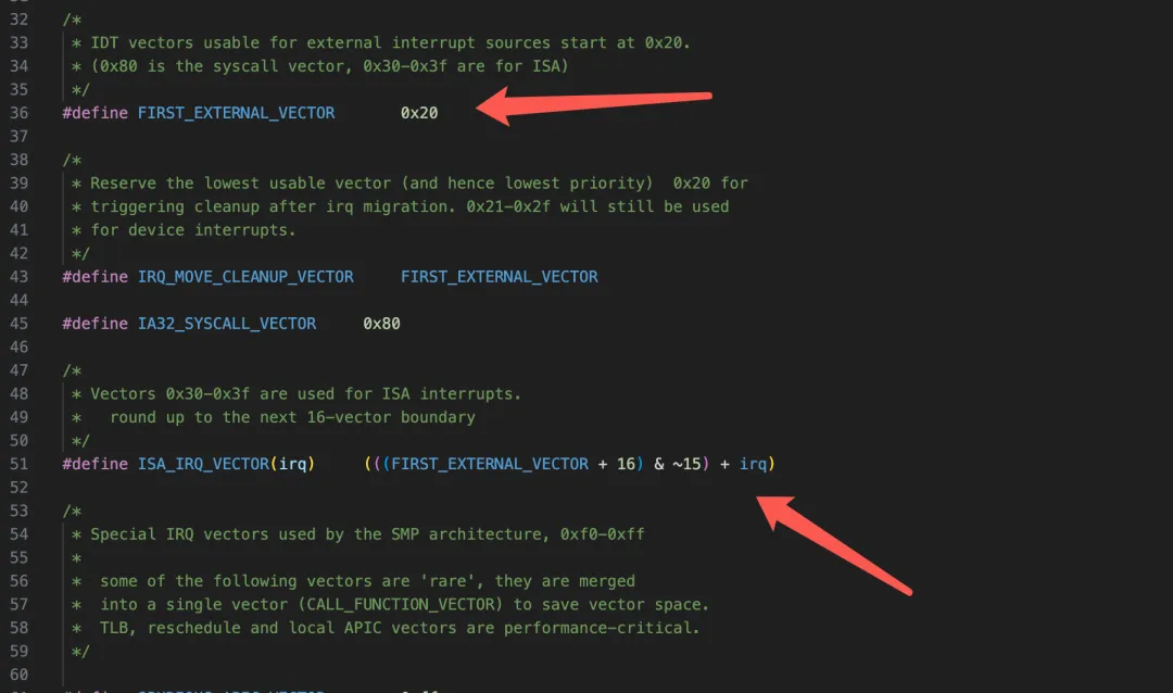 x86 架构下每个cpu有独立的IDT表,可以处理256个中断/* * Linux IRQ vector layout. * * There are 256 IDT entries (per CPU - each entry is 8 bytes) which can * be defined by Linux. They are used as a jump table by the CPU when a * given vector is triggered - by a CPU-external, CPU-internal or * software-triggered event. * * Linux sets the kernel code address each entry jumps to early during * bootup, and never changes them. This is the general layout of the * IDT entries: * * Vectors 0 ... 31 : system traps and exceptions - hardcoded events * Vectors 32 ... 127 : device interrupts * Vector 128 : legacy int80 syscall interface * Vectors 129 ... LOCAL_TIMER_VECTOR-1 * Vectors LOCAL_TIMER_VECTOR ... 255 : special interrupts * * 64-bit x86 has per CPU IDT tables, 32-bit has one shared IDT table. * * This file enumerates the exact layout of them: */#define NMI_VECTOR 0x02#define MCE_VECTOR 0x12/* * IDT vectors usable for external interrupt sources start at 0x20. * (0x80 is the syscall vector, 0x30-0x3f are for ISA) */#define FIRST_EXTERNAL_VECTOR 0x20/* * Reserve the lowest usable vector (and hence lowest priority) 0x20 for * triggering cleanup after irq migration. 0x21-0x2f will still be used * for device interrupts. */#define IRQ_MOVE_CLEANUP_VECTOR FIRST_EXTERNAL_VECTOR#define IA32_SYSCALL_VECTOR 0x80/* * Vectors 0x30-0x3f are used for ISA interrupts. * round up to the next 16-vector boundary */#define ISA_IRQ_VECTOR(irq) (((FIRST_EXTERNAL_VECTOR + 16) & ~15) + irq)/* * Special IRQ vectors used by the SMP architecture, 0xf0-0xff * * some of the following vectors are 'rare', they are merged * into a single vector (CALL_FUNCTION_VECTOR) to save vector space. * TLB, reschedule and local APIC vectors are performance-critical. */#define SPURIOUS_APIC_VECTOR 0xff/* * Sanity check */#if ((SPURIOUS_APIC_VECTOR & 0x0F) != 0x0F)# error SPURIOUS_APIC_VECTOR definition error#endif#define ERROR_APIC_VECTOR 0xfe#define RESCHEDULE_VECTOR 0xfd#define CALL_FUNCTION_VECTOR 0xfc#define CALL_FUNCTION_SINGLE_VECTOR 0xfb#define THERMAL_APIC_VECTOR 0xfa#define THRESHOLD_APIC_VECTOR 0xf9#define REBOOT_VECTOR 0xf8/* * Generic system vector for platform specific use */#define X86_PLATFORM_IPI_VECTOR 0xf7/* * IRQ work vector: */#define IRQ_WORK_VECTOR 0xf6#define UV_BAU_MESSAGE 0xf5#define DEFERRED_ERROR_VECTOR 0xf4/* Vector on which hypervisor callbacks will be delivered */#define HYPERVISOR_CALLBACK_VECTOR 0xf3/* Vector for KVM to deliver posted interrupt IPI */#ifdef CONFIG_HAVE_KVM#define POSTED_INTR_VECTOR 0xf2#define POSTED_INTR_WAKEUP_VECTOR 0xf1#define POSTED_INTR_NESTED_VECTOR 0xf0#endif#define MANAGED_IRQ_SHUTDOWN_VECTOR 0xef#if IS_ENABLED(CONFIG_HYPERV)#define HYPERV_REENLIGHTENMENT_VECTOR 0xee#define HYPERV_STIMER0_VECTOR 0xed#endif#define LOCAL_TIMER_VECTOR 0xec#define NR_VECTORS 256#ifdef CONFIG_X86_LOCAL_APIC#define FIRST_SYSTEM_VECTOR LOCAL_TIMER_VECTOR#else#define FIRST_SYSTEM_VECTOR NR_VECTORS#endif