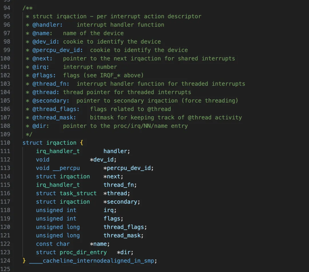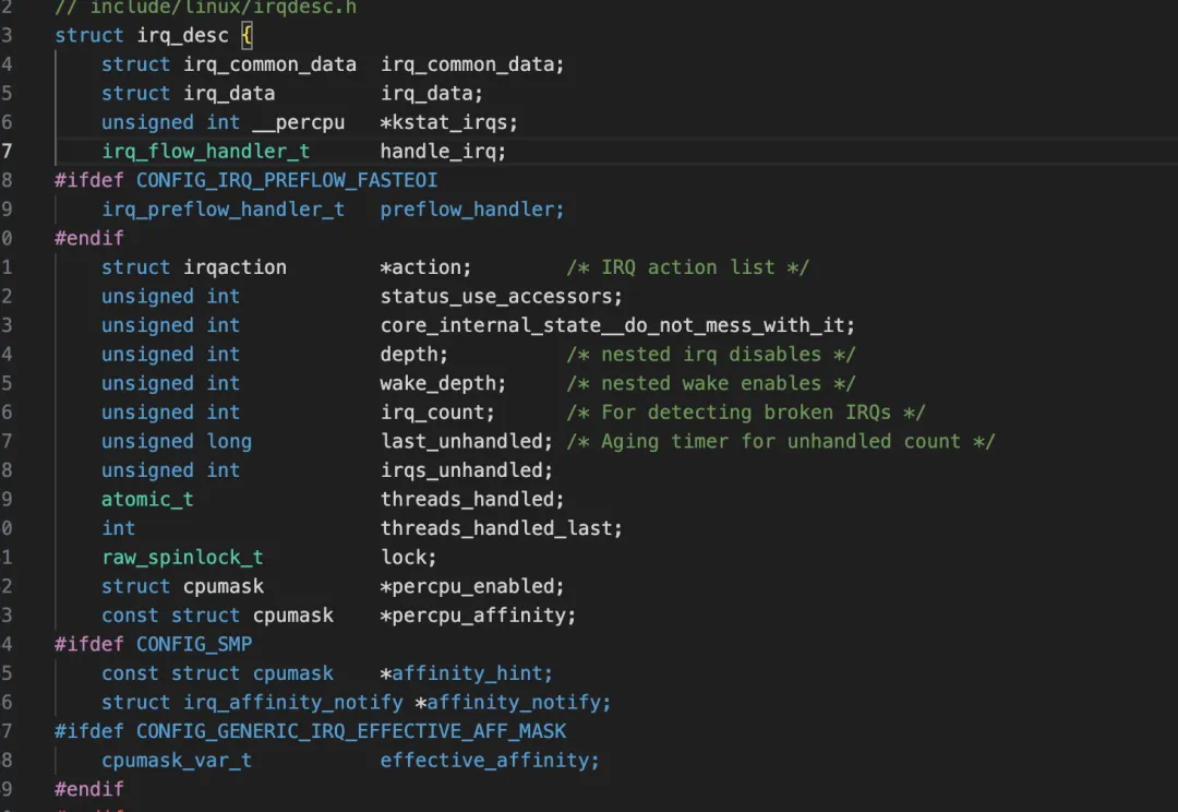 对于每一个中断,都有一个对应的描述结构体irq_desc在irq_desc结构体中,需要关注struct irqaction *action,他是中断处理程序链表irq_handler_t handler; // 主中断处理函数