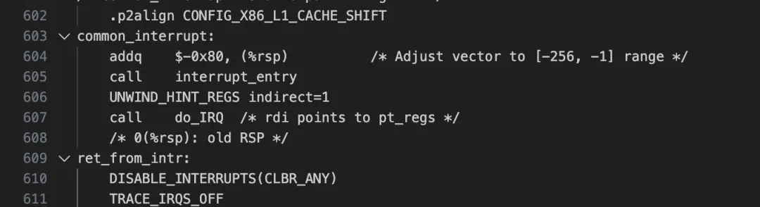 //regs->orig_ax对应着之前在汇编中 addq $-0x80, (%rsp)调整后压入栈的中断向量号(即 ~vector,范围[-256, -1]),通过按位取反(~)操作,将其还原为原始的正数中断向量号。